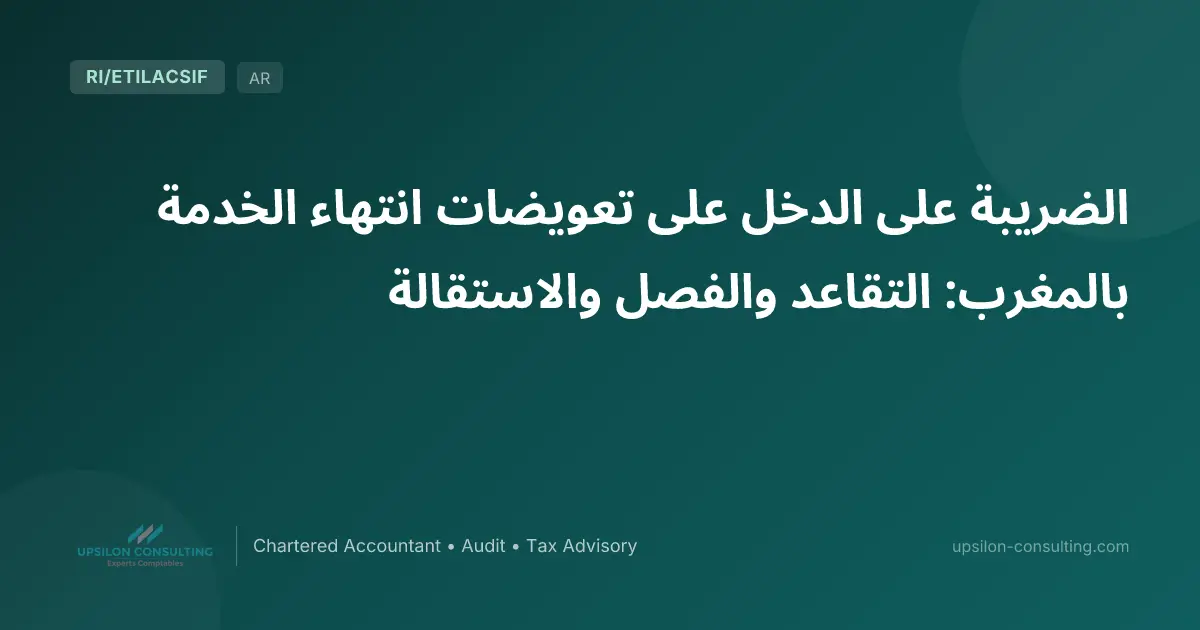 باختصار: تخضع التعويضات المدفوعة عند انتهاء الخدمة (الفصل، التقاعد المبكر، الاستقالة) لقواعد ضريبية متميزة في مجال الضريبة على الدخل. ويُعفى تعويض الفصل في حدود 1.5 مرة التعويض القانوني المنصوص عليه في مدونة الشغل (المادة 57 من المدونة العامة للضرائب). ويخضع الفائض للجدول التصاعدي، مع إمكانية اختيار التقسيط على 4 سنوات أو نظام السعر المتوسط. وتستفيد معاشات التقاعد من تخفيض بنسبة 70% على الشريحة الأولى البالغة 168,000 درهم.