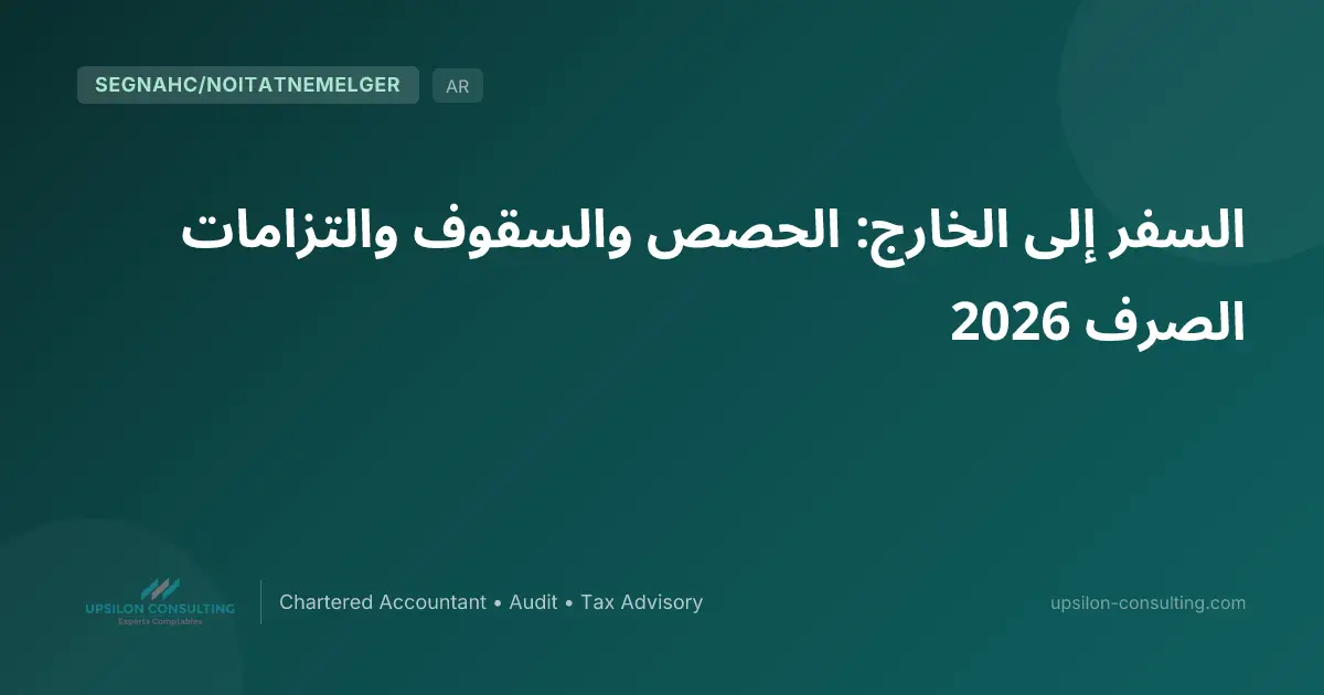 باختصار: تحدد IGOC 2026 (Art. 132-155) حصص السفر إلى الخارج للمقيمين المغاربة: 500 000 MAD سقف للسفر الشخصي، وحتى 1 500 000 MAD لسفر الأعمال للمتعاملين المصنفين، و15 000 MAD/شهر للدراسة في الخارج. يجب إرجاع العملات غير المستعملة في أجل 30 يوماً بعد العودة. يرافقكم Upsilon Consulting في تحسين حصص الصرف الخاصة بكم.