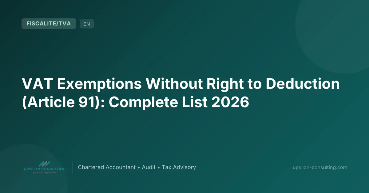 In brief: Article 91 of the General Tax Code (CGI) lists the transactions exempt from VAT without right to deduction (WORD). The operator does not charge VAT to their customers, but cannot recover the VAT paid to their suppliers either: this is the blocking effect (effet de butoir). This regime differs from the exemption with right to deduction (art. 92) and from out-of-scope transactions. To find out which regime applies to your activity, use our VAT qualification tool.