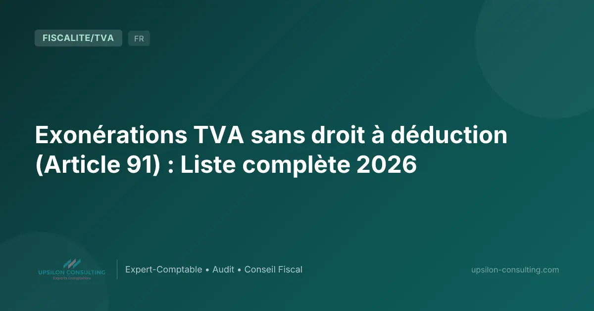 En bref : L’article 91 du Code général des impôts (CGI) dresse la liste des opérations exonérées de TVA sans droit à déduction (SDD). L’opérateur ne facture pas de TVA à ses clients, mais ne peut pas non plus récupérer la TVA payée à ses fournisseurs : c’est l’effet de butoir. Ce régime se distingue de l’exonération avec droit à déduction (art. 92) et des opérations hors champ. Pour savoir quel régime s’applique à votre activité, utilisez notre outil de qualification TVA.