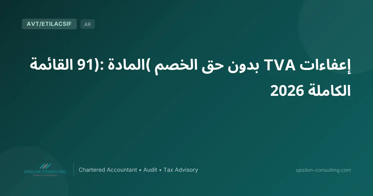 باختصار: تحدد المادة 91 من المدونة العامة للضرائب قائمة العمليات المعفاة من TVA بدون حق الخصم (ب.ح.خ). فالخاضع للضريبة لا يفوتر TVA لزبنائه، لكنه لا يستطيع أيضاً استرداد TVA المؤداة لمورديه: وهذا هو الأثر الحاجز (butoir). يختلف هذا النظام عن الإعفاء مع حق الخصم (المادة 92) وعن العمليات خارج نطاق التطبيق. لمعرفة النظام المطبق على نشاطكم، استخدموا أداة تأهيل TVA.
