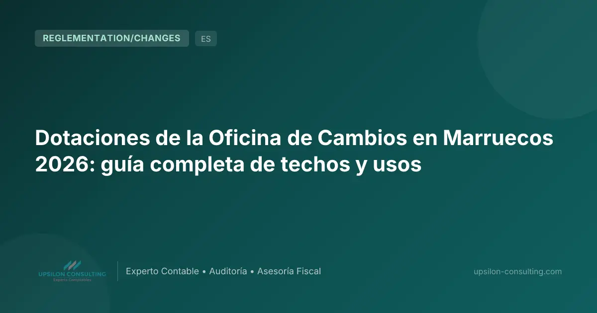 En resumen: Las dotaciones de la Oficina de Cambios son las asignaciones anuales en divisas concedidas a los residentes marroquíes por la IGOC 2026 para cubrir sus necesidades fuera de Marruecos. Principales montos de base 2026: viajes personales 100 000 MAD/año (tramo de base, ampliable bajo condiciones de IR), viajes de negocios calculados sobre el impuesto de sociedades abonado, estudios en el extranjero 15 000 MAD/mes, e-commerce personas físicas 20 000 MAD/año, e-commerce sociedades desde 50 000 MAD (base IS). A estas se suman las dotaciones para cuidados médicos, importación de servicios y Hajj/Umra. Esta guía pilar sintetiza los mínimos, techos, condiciones y procedimientos de cada régimen.